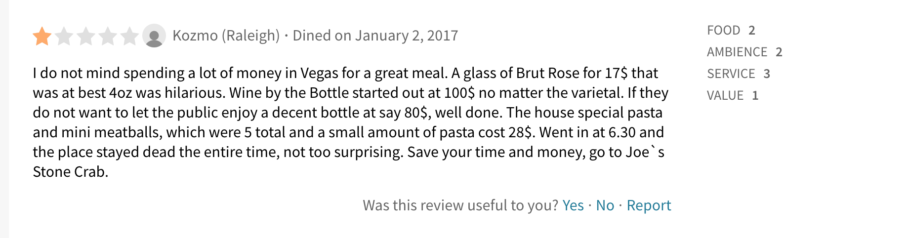 Another one-star review but it seems that this patron was seeking a more affordable meal so is this bad experience his fault, or the restaurant's?