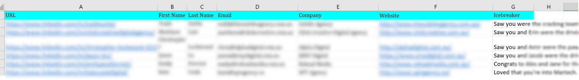I added a new column called "Icebreaker" and then went through one by one to add a personalised introductory sentence to each row. Yep, that's right. Roll your sleeves up. This involved opening each company's website, LinkedIn, looking through recent media, socials etc. and genuinely doing my homework. Each row took me roughly 8-12 minutes on average to create a compelling opener.