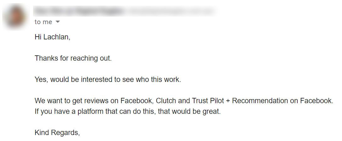 Our target recipient for our first cold email campaign: marketing reps and agencies who might use Cloutly as a tool for their client campaigns to get more reviews and win sales using social proof. They had to be a decision-maker. That was our business development approach.