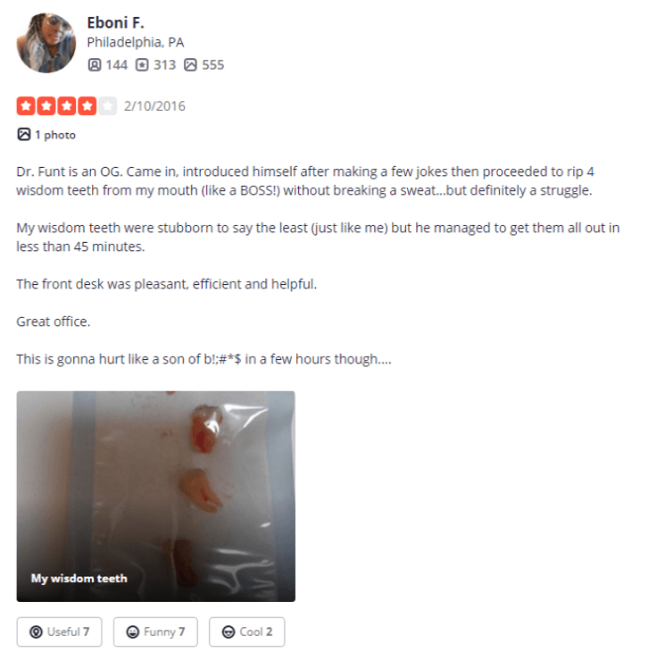 This reviewer seemed to have a whale of a time - maybe the pain meds were still in action when he wrote this review. They have also shared a photo of their wisdom teeth. Thanks, I guess?