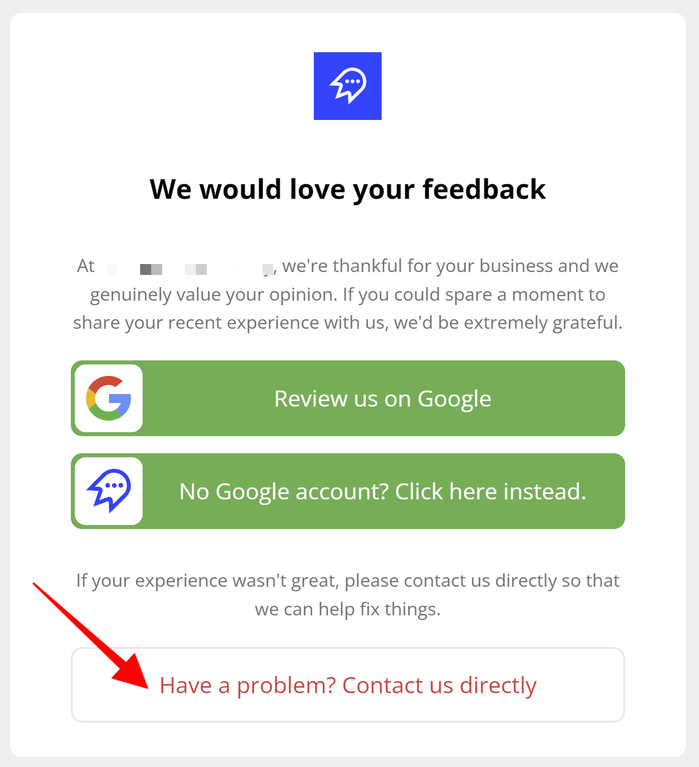 When clicked, this button opens a feedback form and allows the customer to ask you for help or provide you with direct feedback (before their issue results in a bad review).