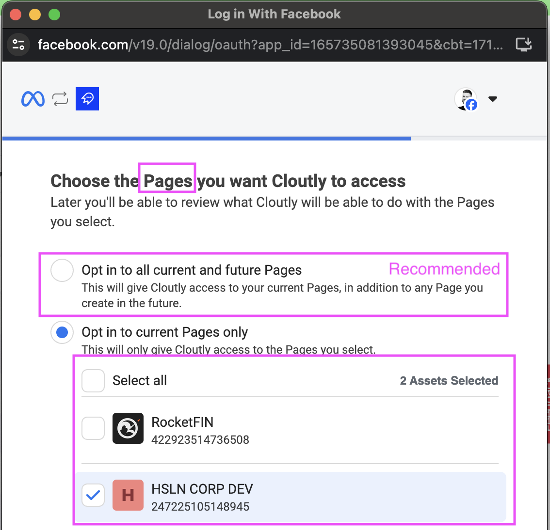 - Ensure to click "Edit Settings" when connecting with Cloutly so you are giving permission for each Page.