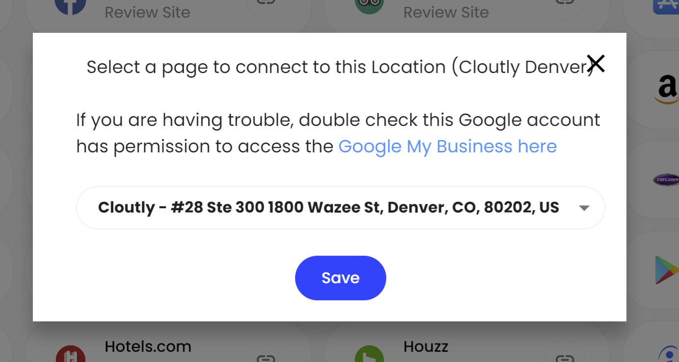 - Select the Google/Facebook page from the list that appears