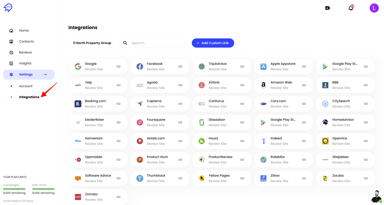 First, go to Integrations from the side menu (underneath Settings). Here, you'll see all the available review sites up the top, and all CRM integrations at the bottom half of the page (like HubSpot).