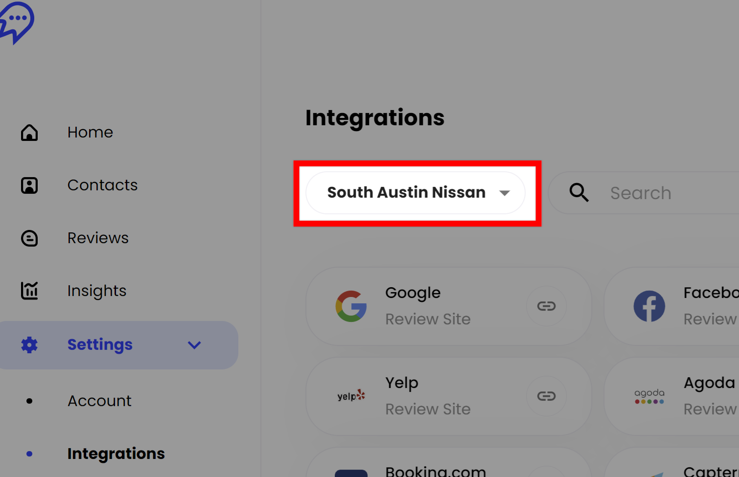 For each location you've connected, you can connect its corresponding review sites. For example, if you have 10 locations, you might have 10 Google or Facebook pages. You can select the active location by clicking through the selector at the top of the page: