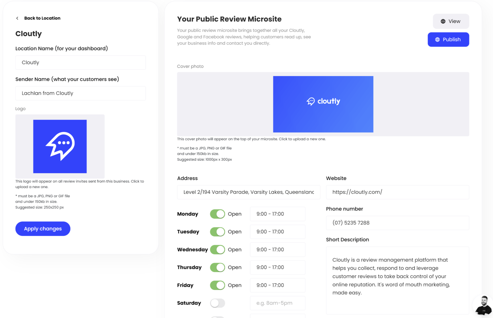 Every location you connect to Cloutly allows you to publish a public-facing microsite. It's your all-in-one business listing page that brings together your information, opening hours, services, and of course, your reviews. For businesses who don't spend thousands of dollars a month on their website or SEO, your free microsite helps customers find you, see your reviews and get in touch with you online.