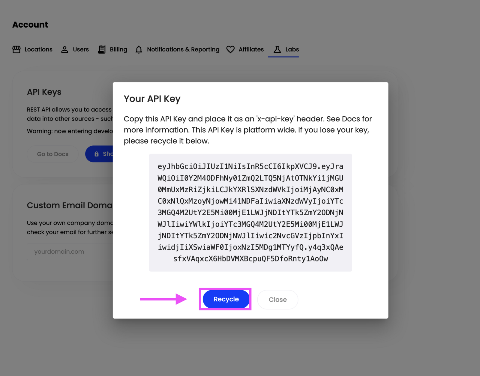 Articles on: Developer Docs (API)How to find your API Key?How to find your API Key?How to recycle your API Key?If you've found the API key is compromised, ensure to rotate the key. This action will invalidate the old API key immediately and generate a new one for usage.Updated on: 16/10/2024