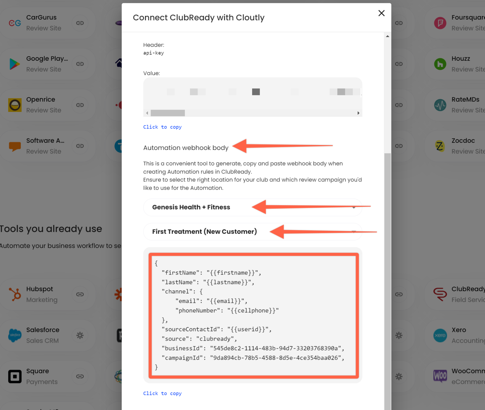Step: Copy and paste your API Key from the ClubReady integration window within Cloutly's Integrations page: