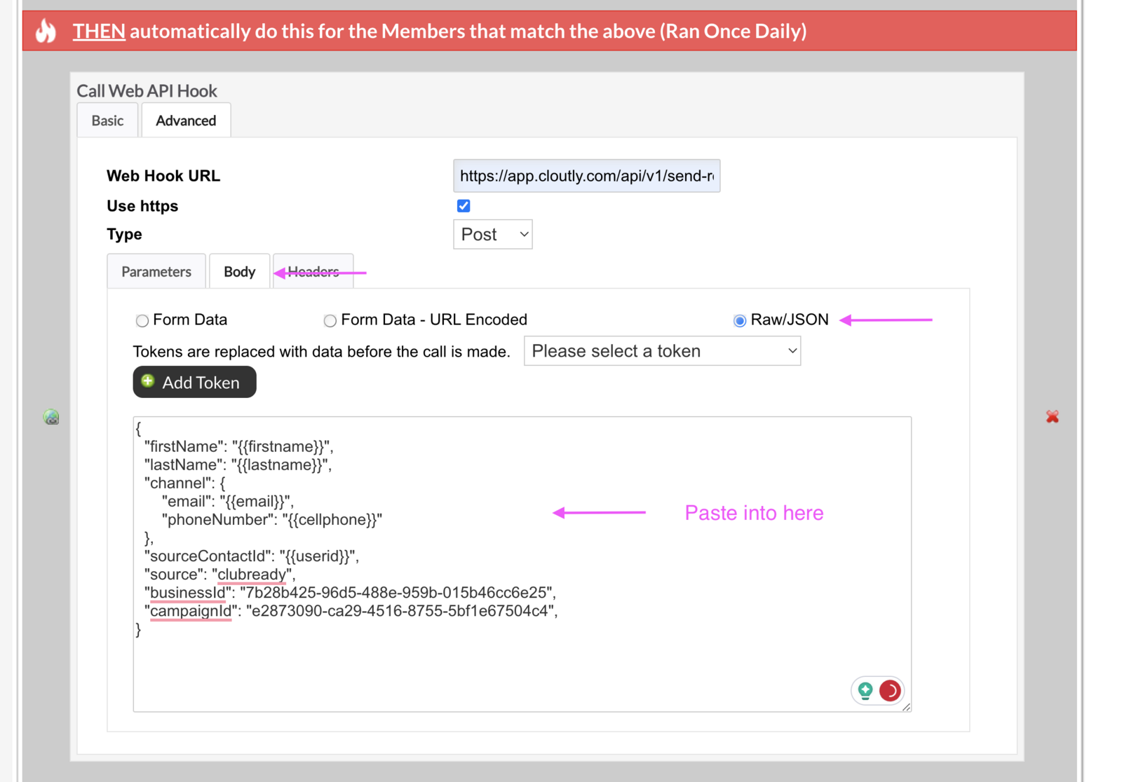 Step: Paste the webhook body into ClubReady webhook body section (see image) below.