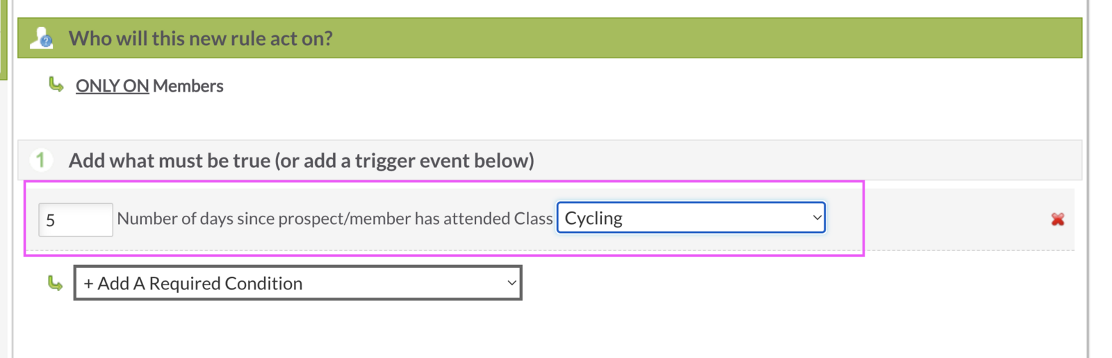 You can choose any rule you'd like. We recommend: "Number of days X since Prospect/member has attend X class".