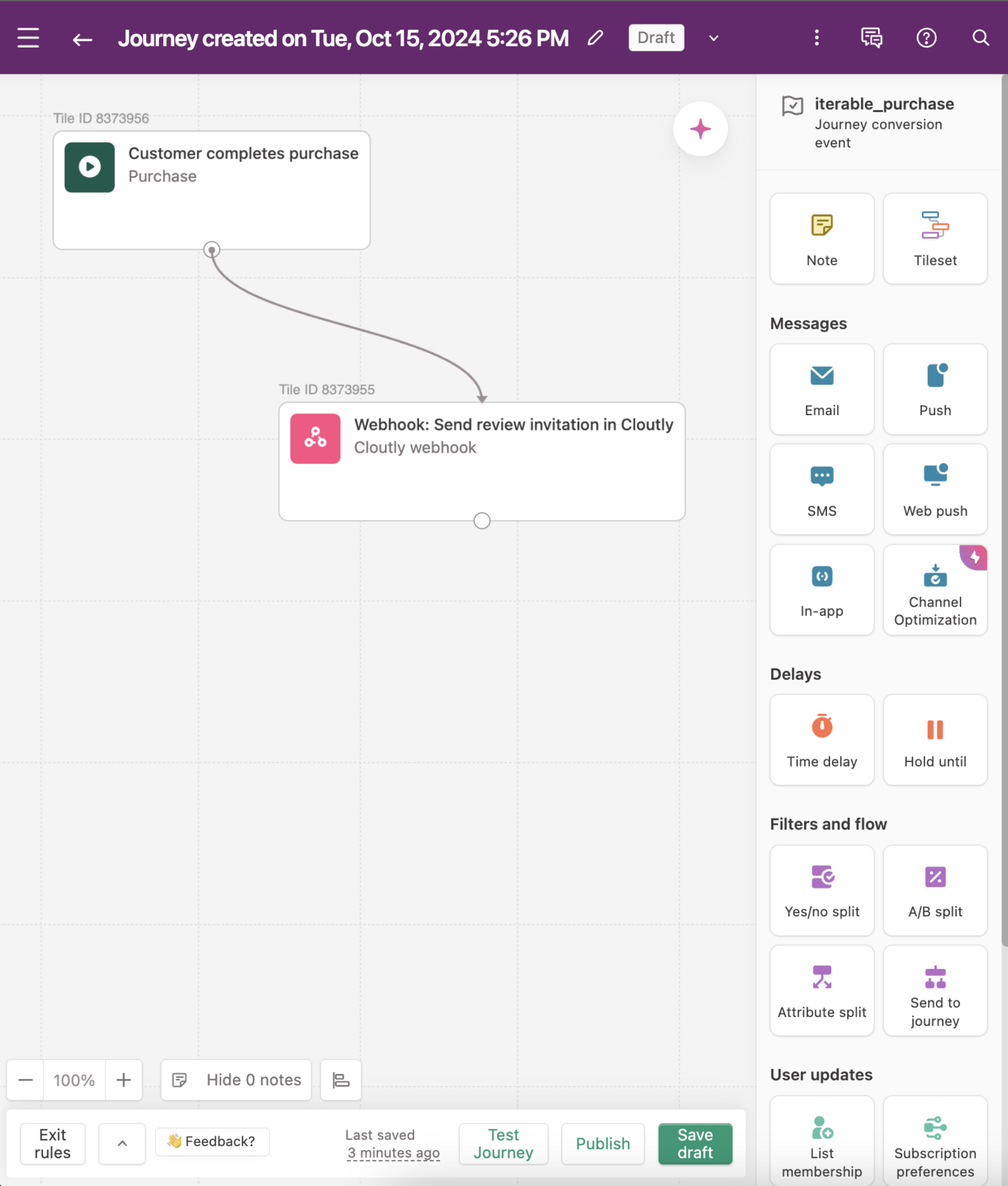 If your business uses Iterable, follow this guide to integrate Iterable with Cloutly. This integration will allow you to automatically send review campaigns after a trigger in Iterable.