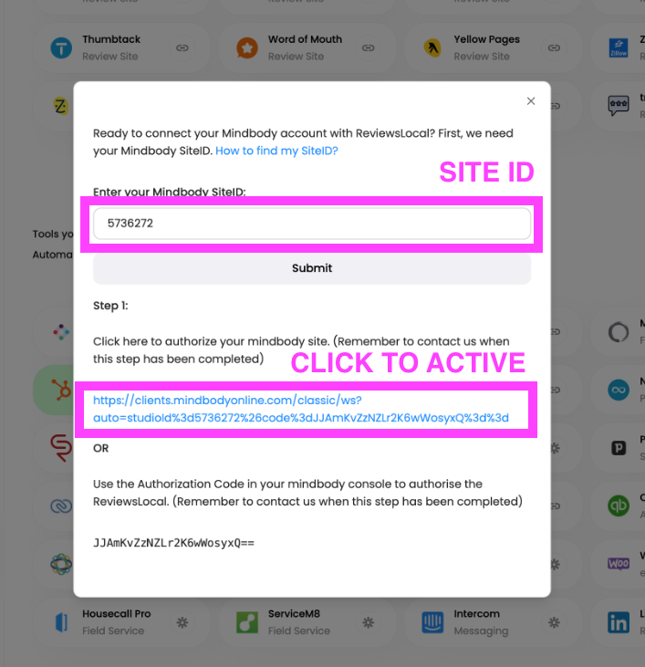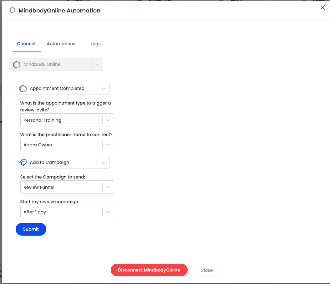 If your business uses Mindbody Online, follow this guide to integrate Mindbody with Cloutly. This integration will allow you to automatically send review campaigns after an appointment has been completed.