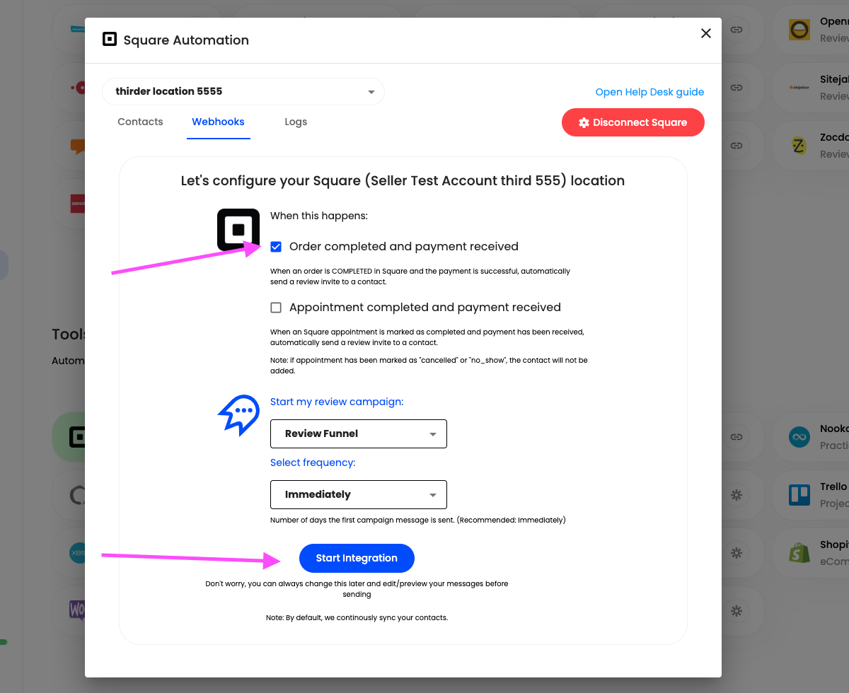 1. After connecting your review sites, click on the Square integration to configure when and how your review campaigns should be sent.