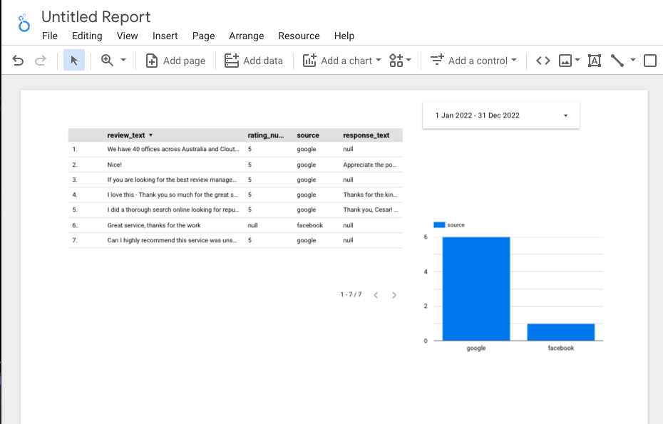 This guide isn't comprehensive on how Looker works, so check the internet for that. If you want to see your reviews in this integration, you need to ensure you have them connected in Cloutly.