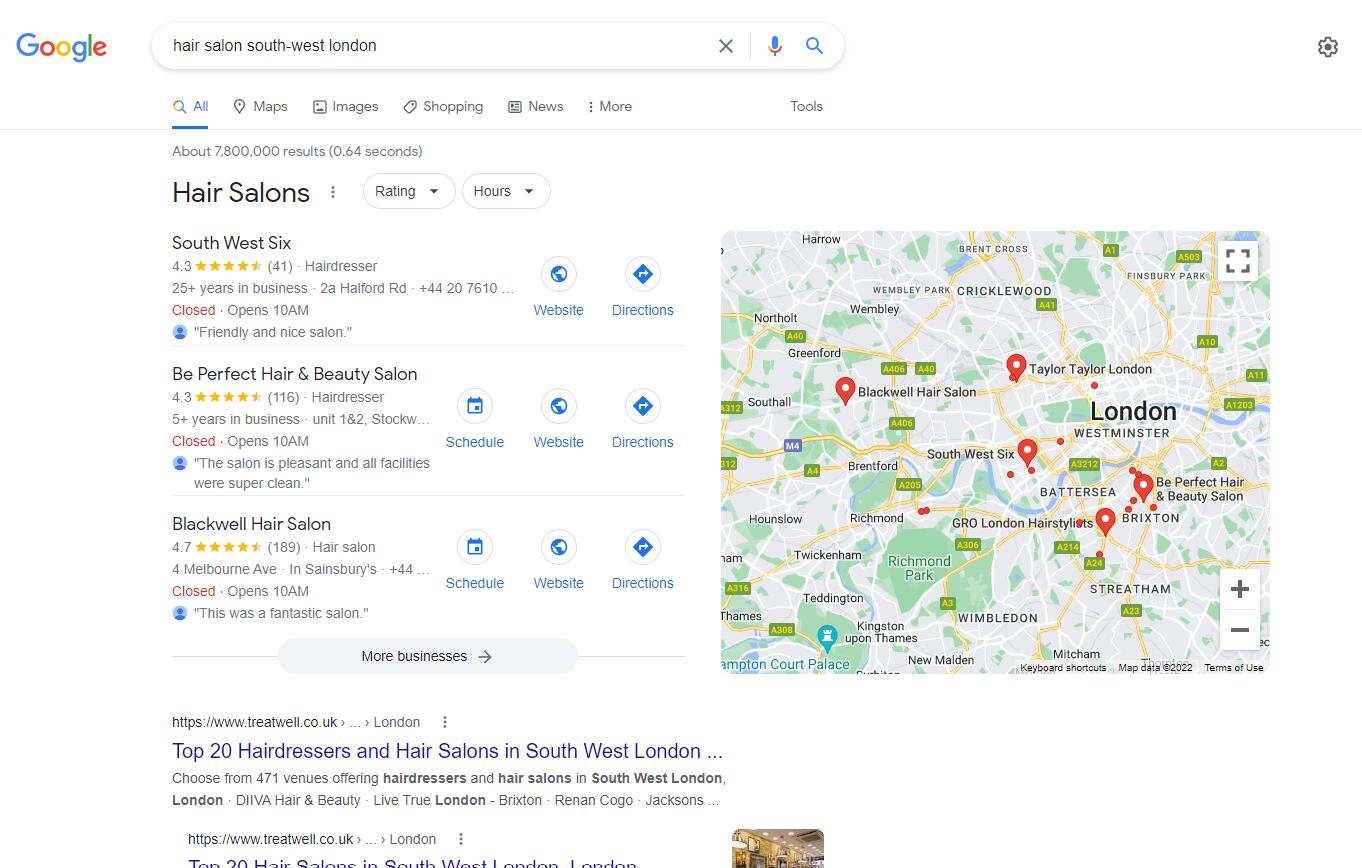If you type in 'hair salon' into the little search box, the Google search results will show all local businesses on Google Maps (which is the first page of the search engine). This is what you call local SEO, and if you don't have a business listing on Google, you won't show up even if you're local to the user.