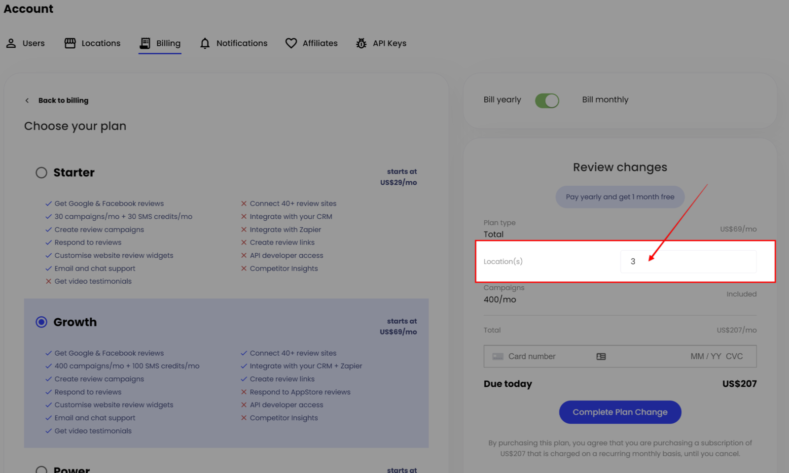 3. Enter a new number of locations to add to your plan and then click "Complete Plan Change"