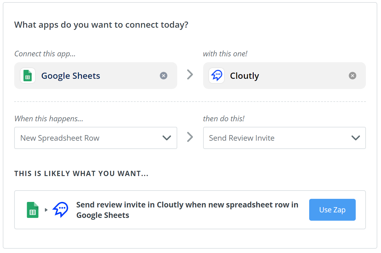 Now for the fun stuff: getting more reviews, at scale! In this case, we tell Zapier to trigger a new review invite when 'something' happens. Let's look at some examples.