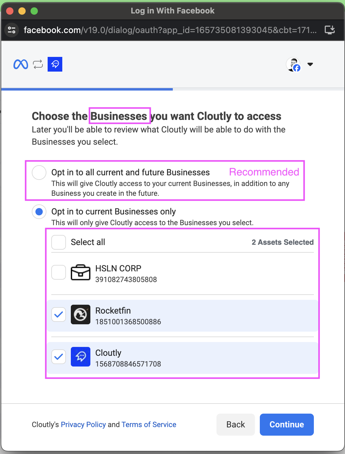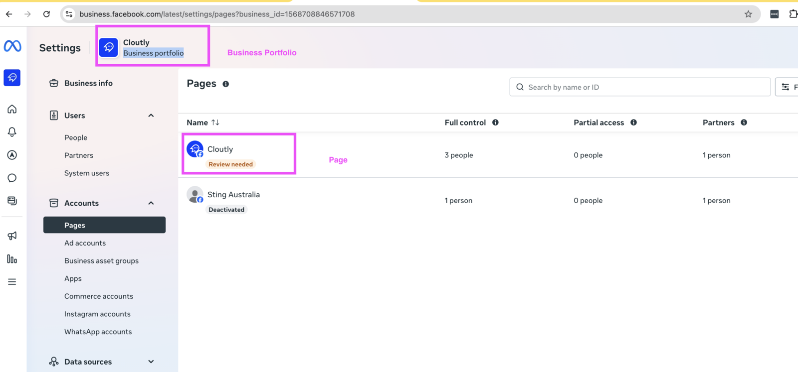 If your Facebook Page is connected to a Meta Business Portfolio, you must ensure the following steps are done. Otherwise you may not be able to see your Facebook page when connecting it into Cloutly.