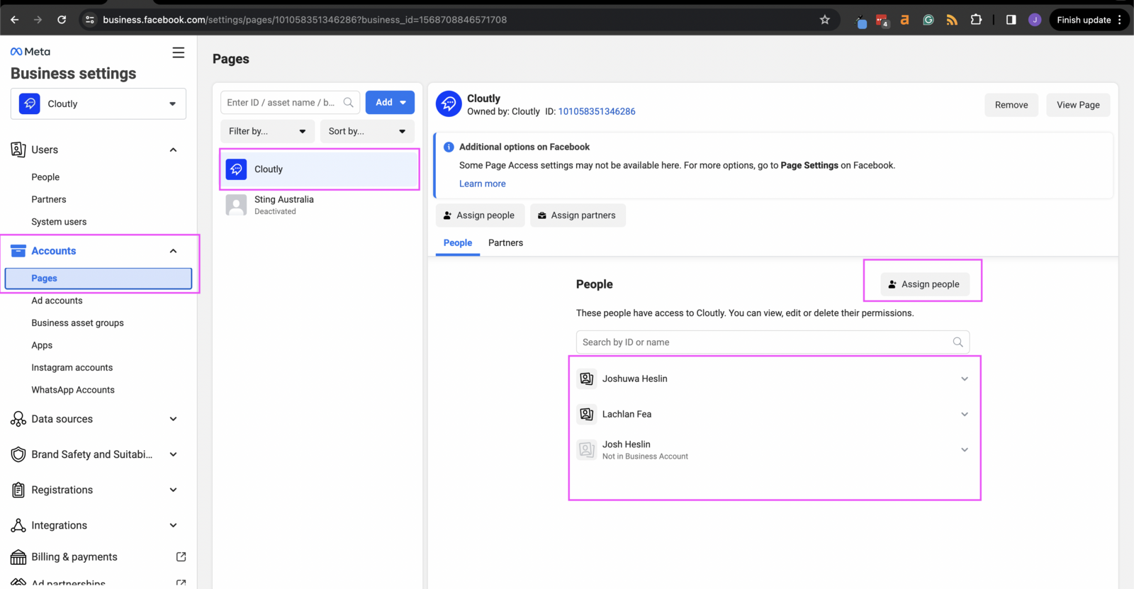 2 - Ensure your user account is added to each Page.