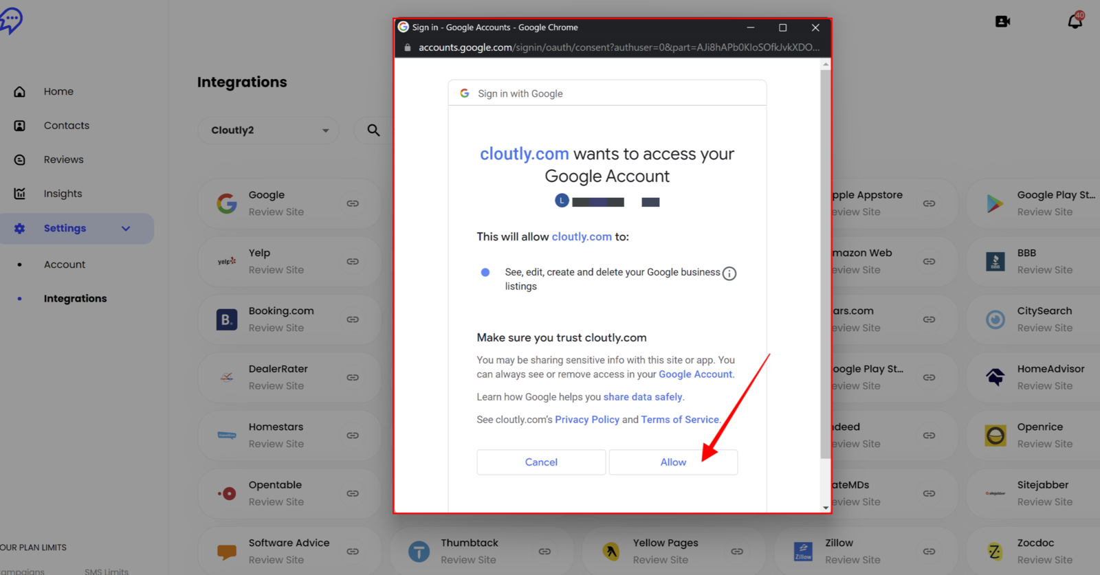 Note: if you do not see a pop-up window from Facebook/Google when you click on the integration button, ensure any ad blockers are turned off and that you're not using Incognito mode.