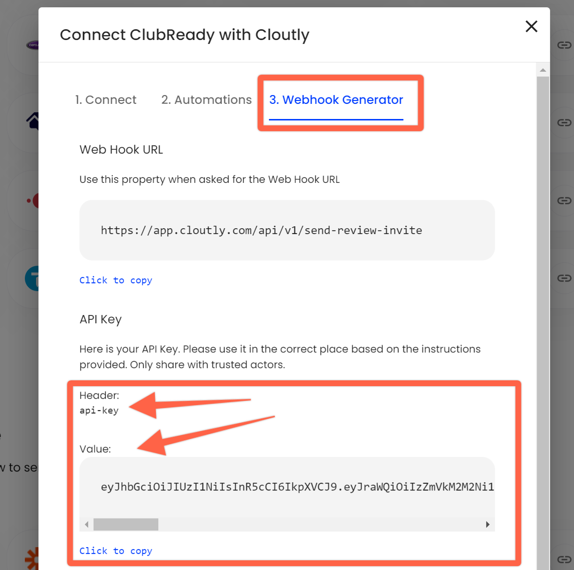Step: Copy and paste your API Key from the ClubReady integration window within Cloutly's Integrations page: