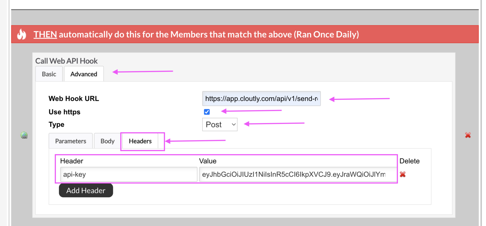 • Go to the Webhook Generator tab and copy and paste the Header and API Key