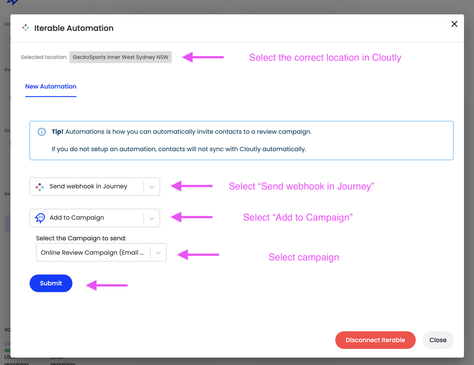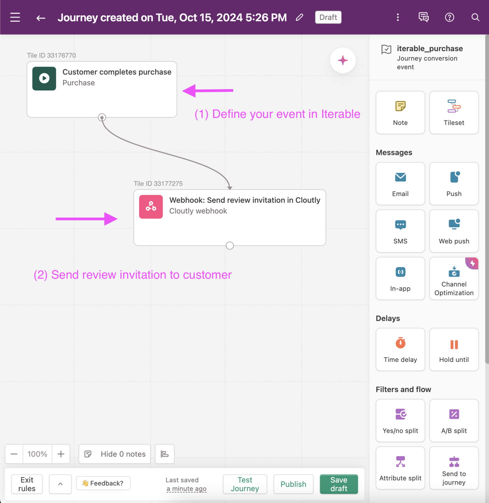 If your business uses Iterable, follow this guide to integrate Iterable with Cloutly. This integration will allow you to automatically send review campaigns after a trigger in Iterable.