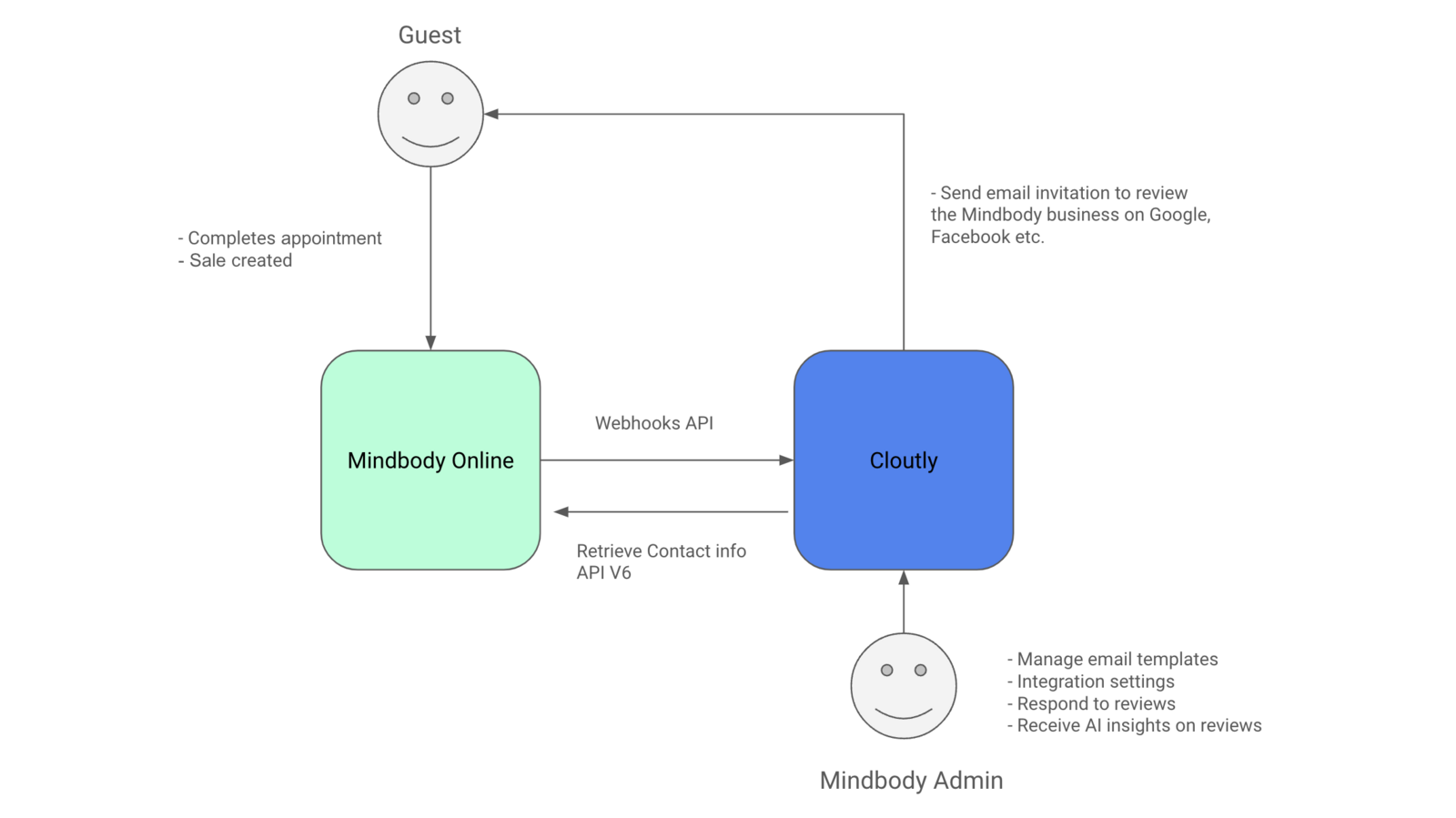 When a sale is completed in Mindbody POS, a webhook is fired to Cloutly that registers them as a contact and sends a review invitation.