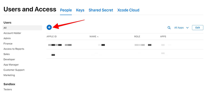 - Click the “+” button at the top of the user list. Users can be invited by anyone with Account Holder, Admin, or App Manager permissions in App Store Connect.