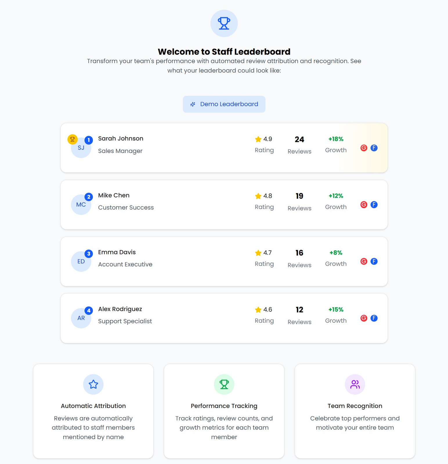 When you first activate the Staff Leaderboard, you’ll see a demo view showing how your rankings could look once your team is added.